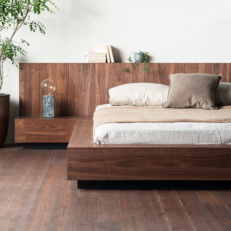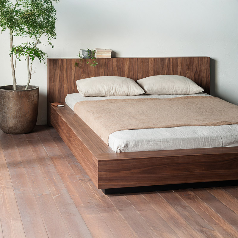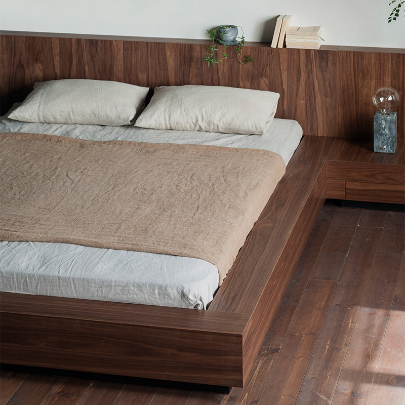 Modern and minimal, this bed features a rich wood finish with an extended headboard and integrated side tables. Crafted for both style and functionality, it creates a seamless and sophisticated bedroom statement.