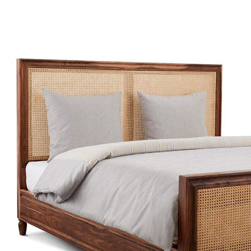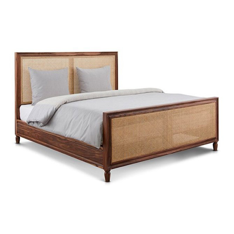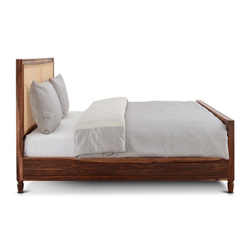 Elegant Ashwood bed with Melamine Polish, featuring cane work on headrest and footrest for a timeless look. Includes one-side pull-out drawer storage for added convenience.