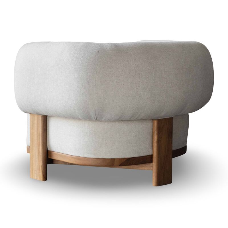 The armchair features a sculptural design with a three-legged frame, plush upholstery, and a high backrest, combining comfort and style for a sophisticated statement piece.