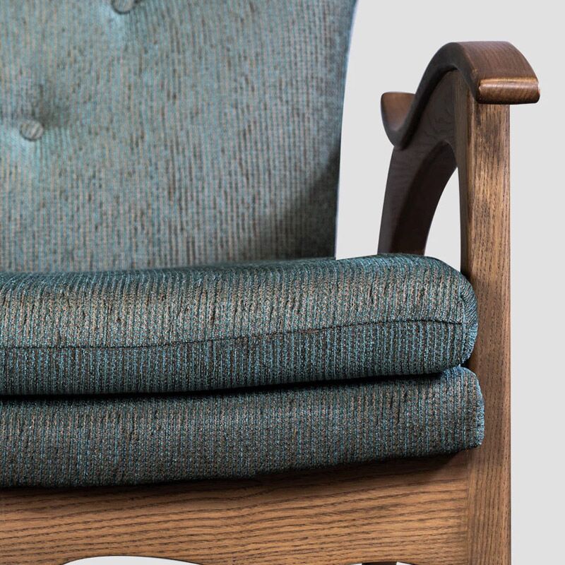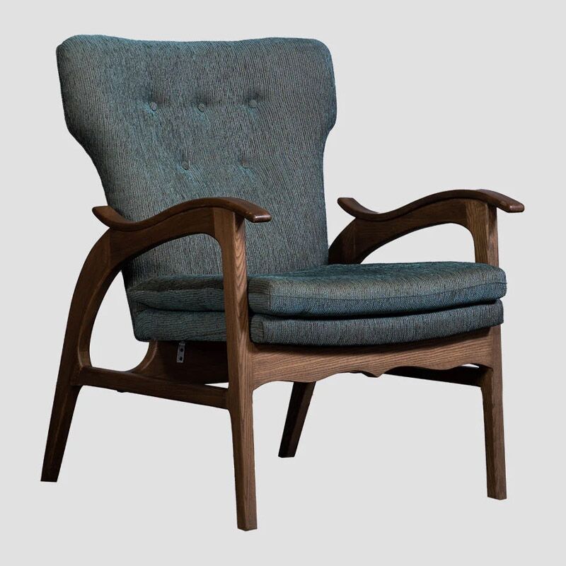 The armchair exudes elegance, characterized by its sculpted curves, arched armrest, and polished wooden finish. This design seamlessly blends comfort with timeless artistry.