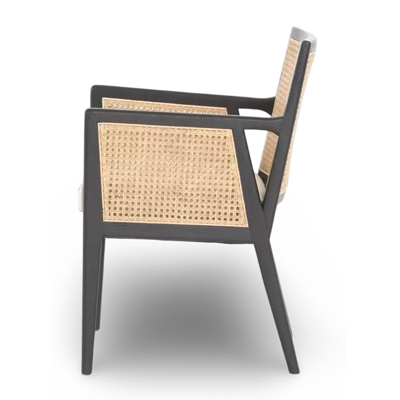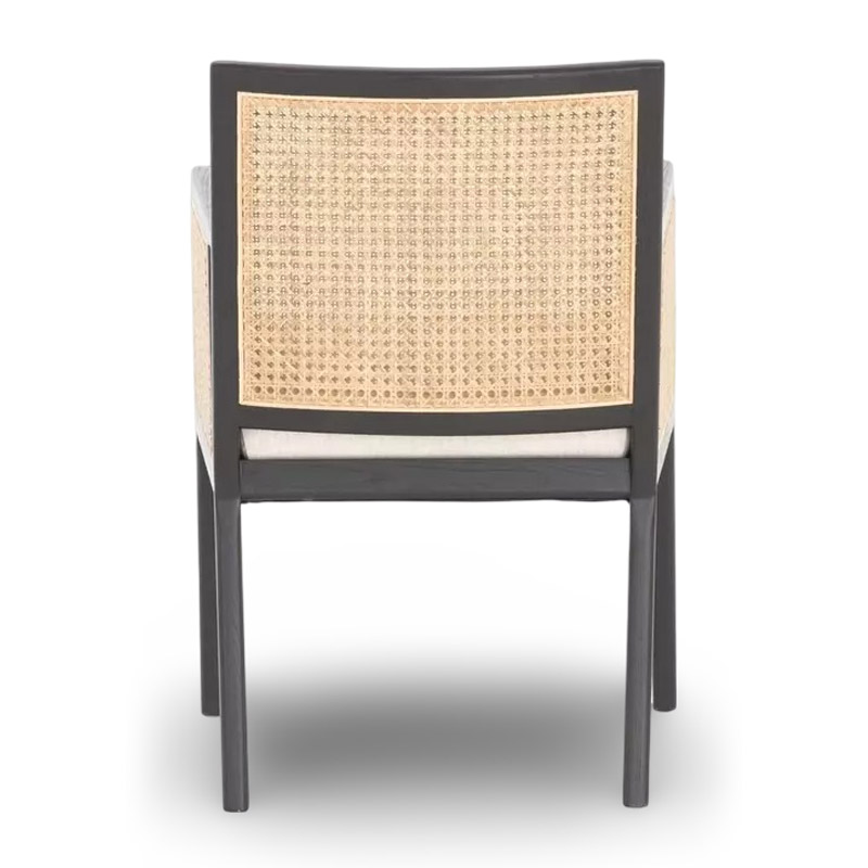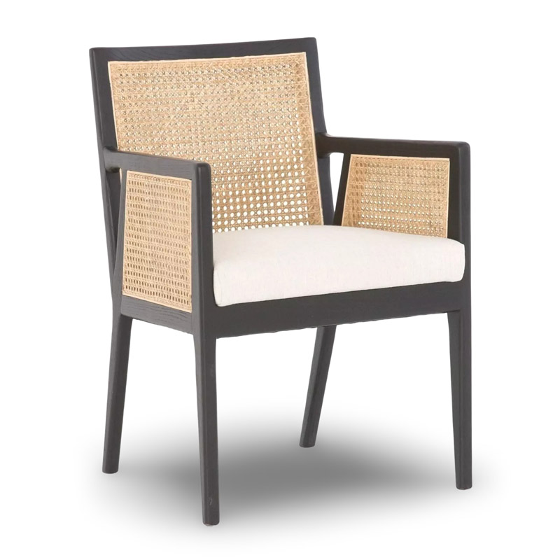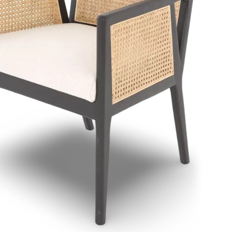 Contemporary chic meets the coastal cool in this Chair. Its natural woven rattan provides rich visual contrast to its sleek solid wood frame, while a soft linen