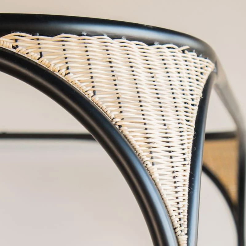 The Andaman Narcodam Canopy Bed is a stunning blend of Acacia wood, mild steel, upholstery, and intricate rattan weaving, offering a perfect balance of traditional craftsmanship and modern aesthetics.