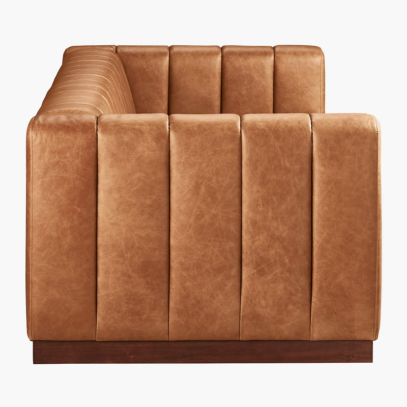 Cushy channels of top-grain leather line the length of this sofa. Soft to the touch with a sit on the firmer side, this unexpectedly deep sofa is comfy enough to really curl up.