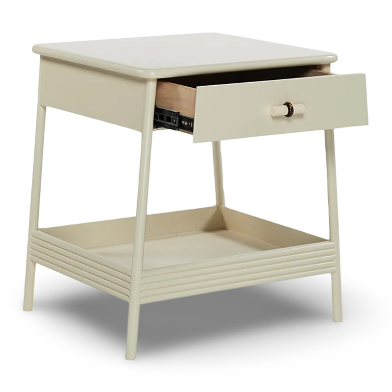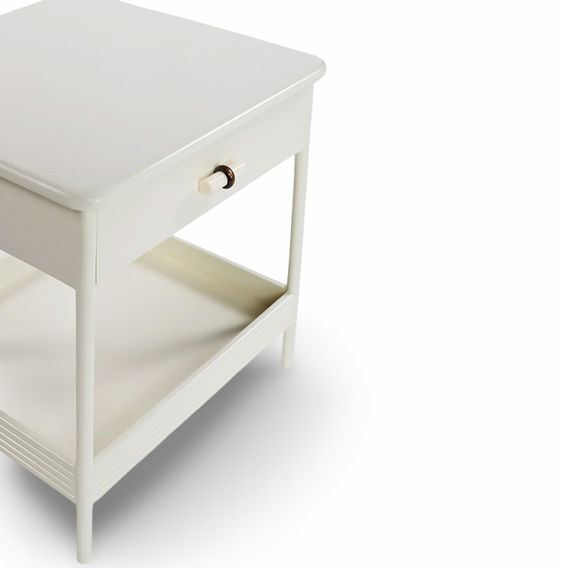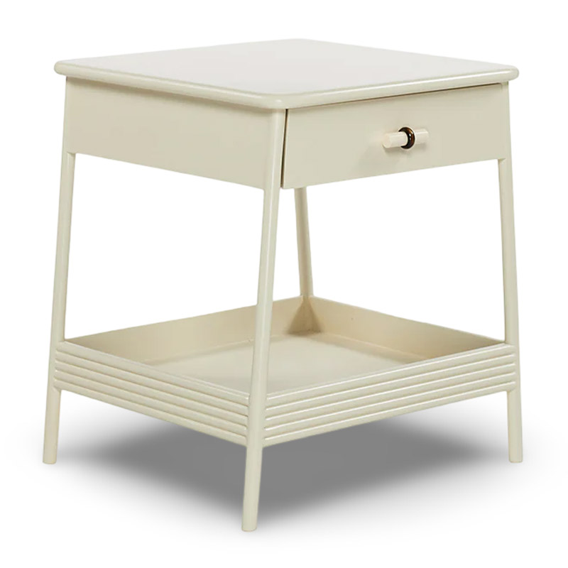 The sidetable features a custom handle knob and brass details, with both tray and drawer storage. It’s compact, lightweight, and made from solid wood with a PU satin finish.