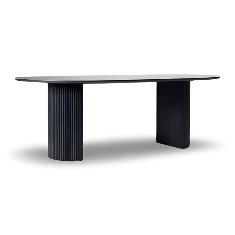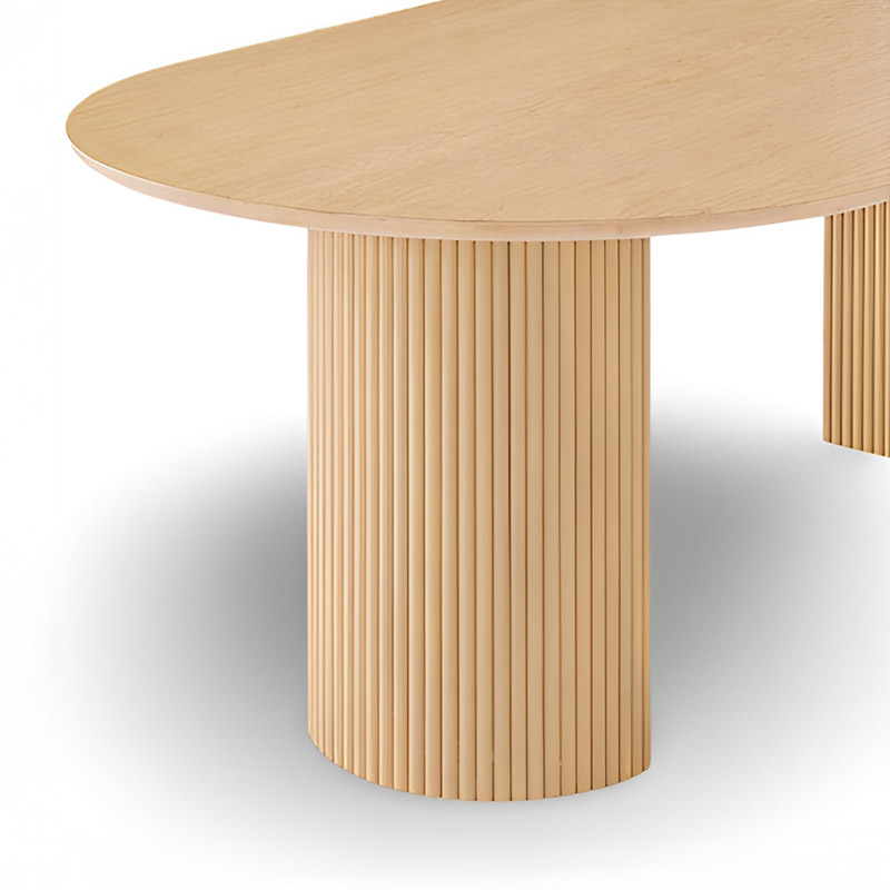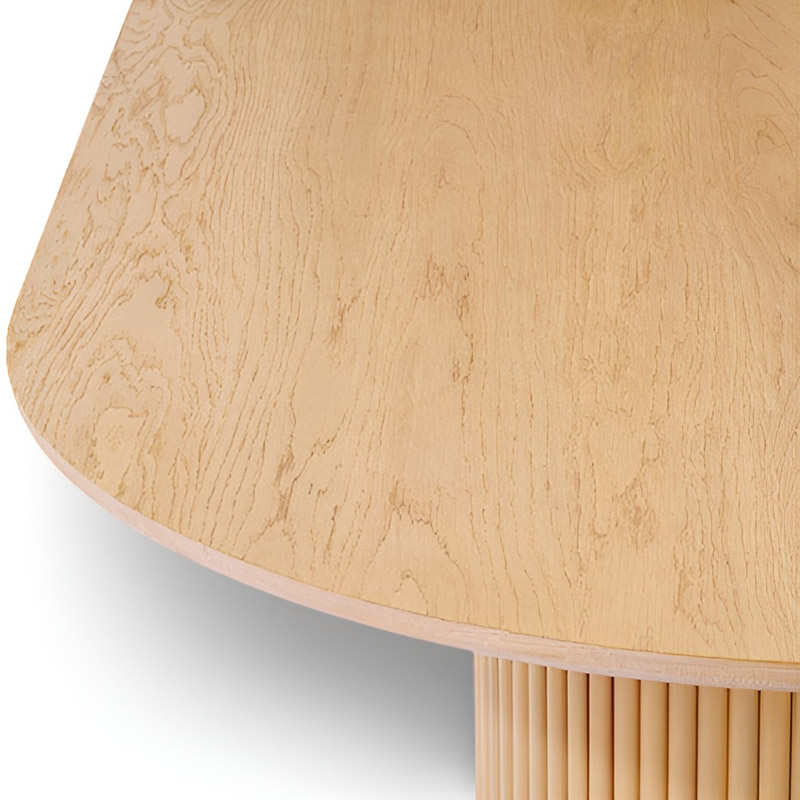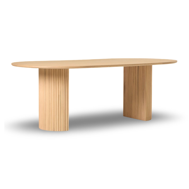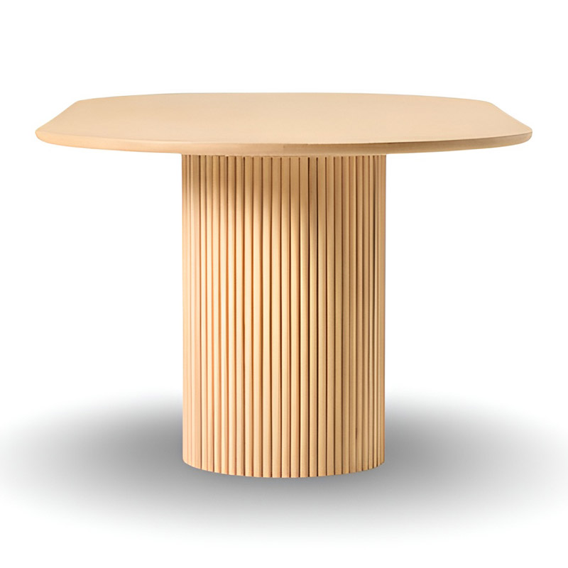 The dining table stands out with its elegant slatted design and soft, graceful contours.