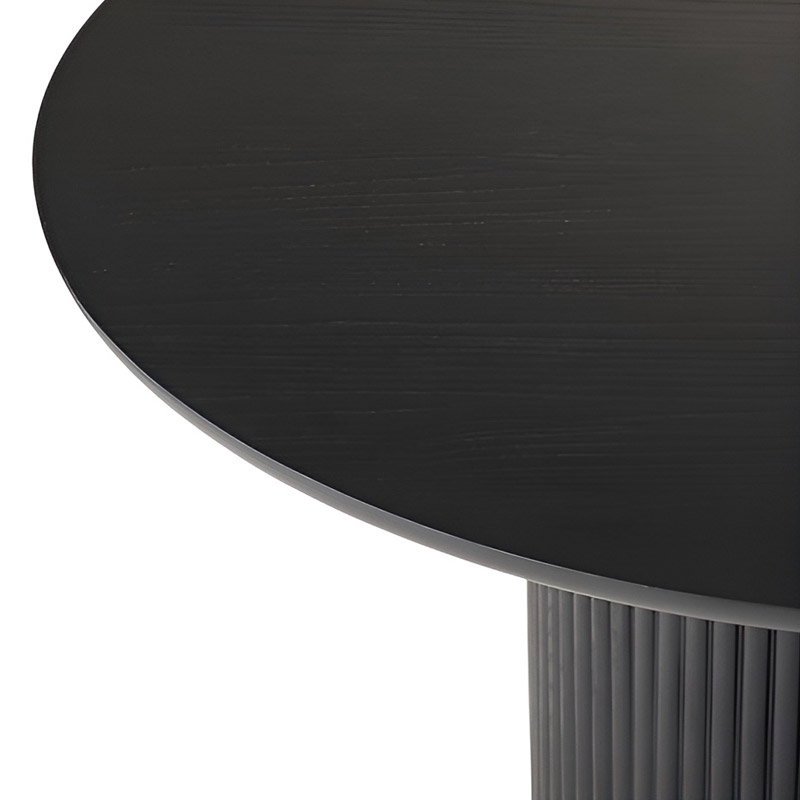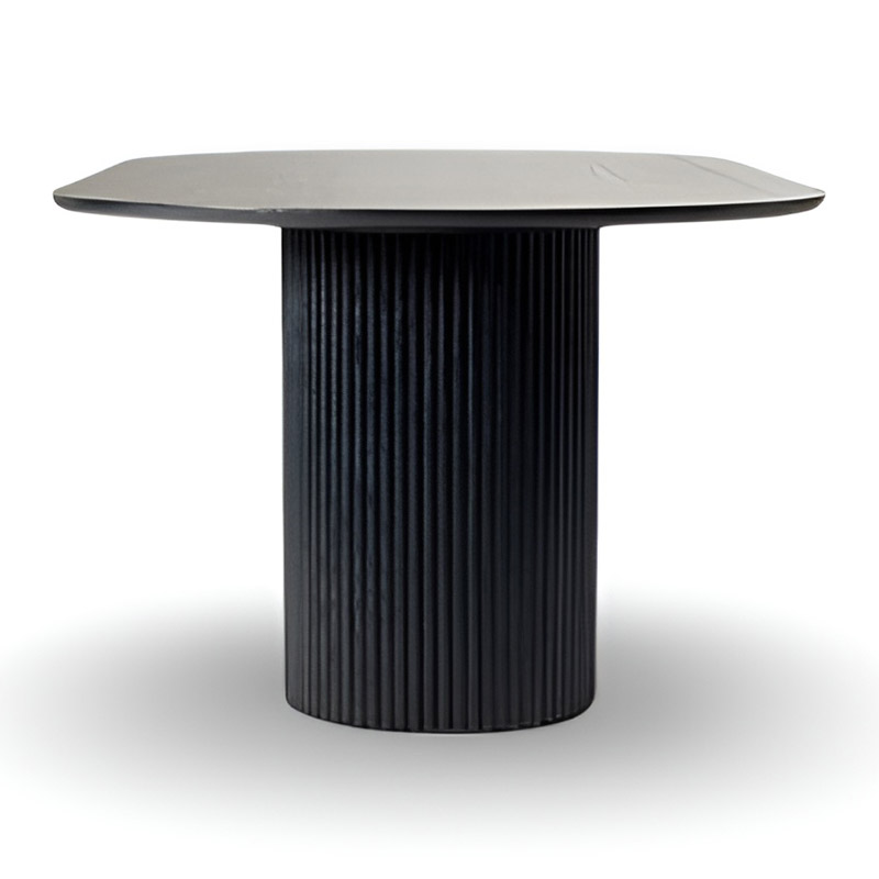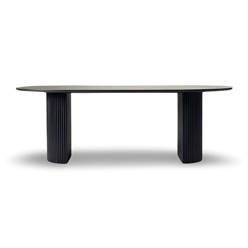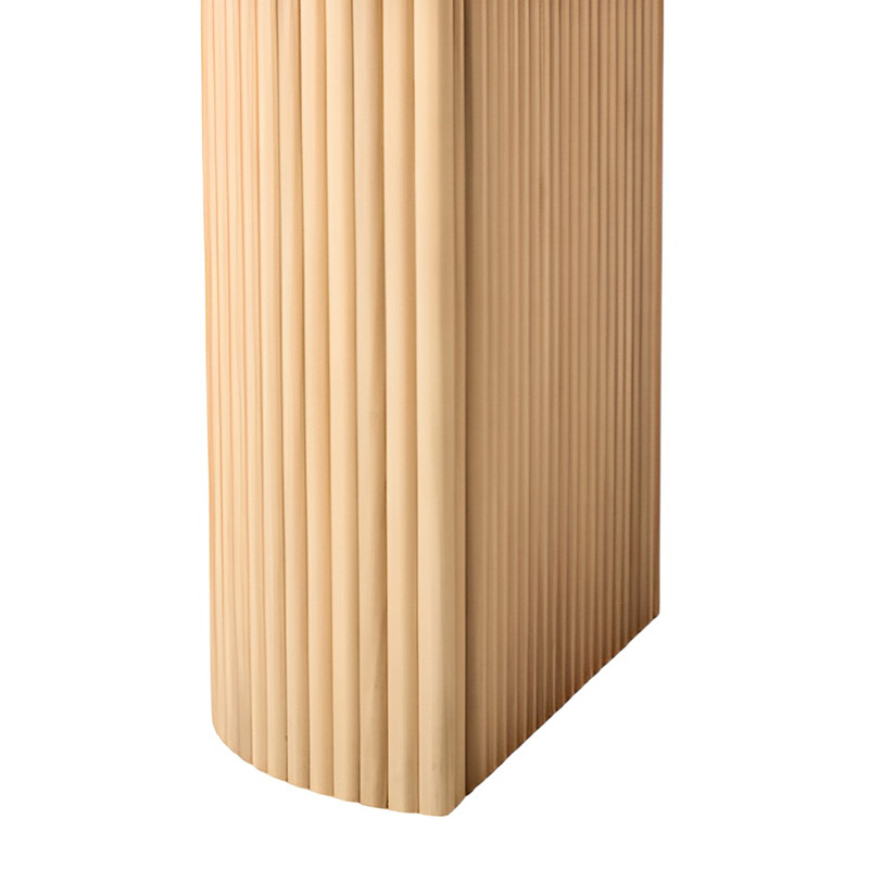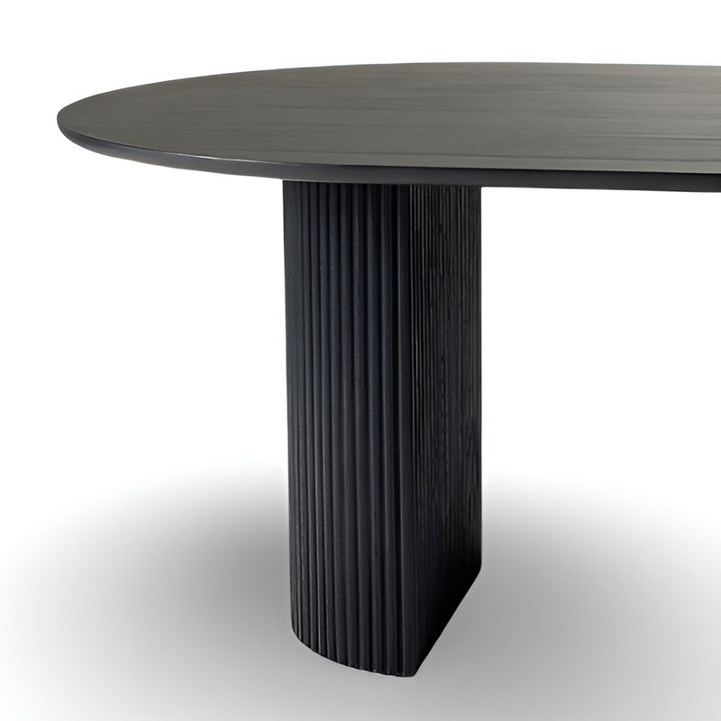 The dining table stands out with its elegant slatted design and soft, graceful contours.