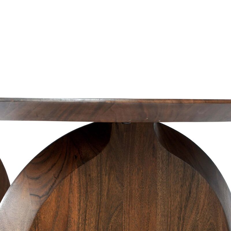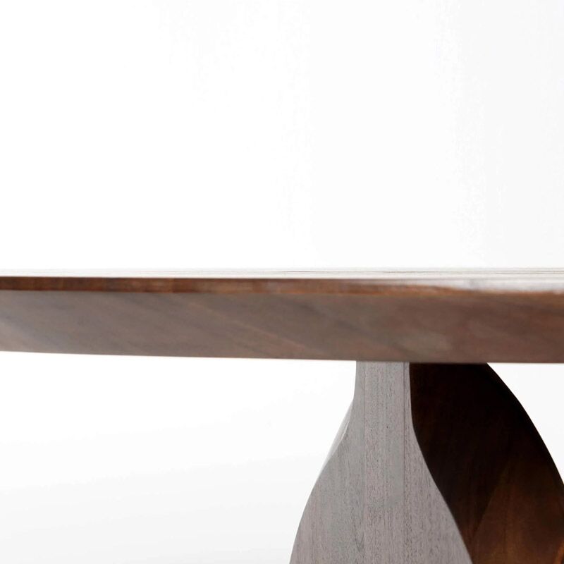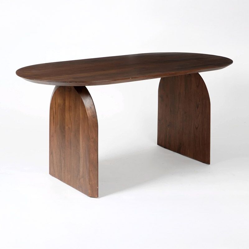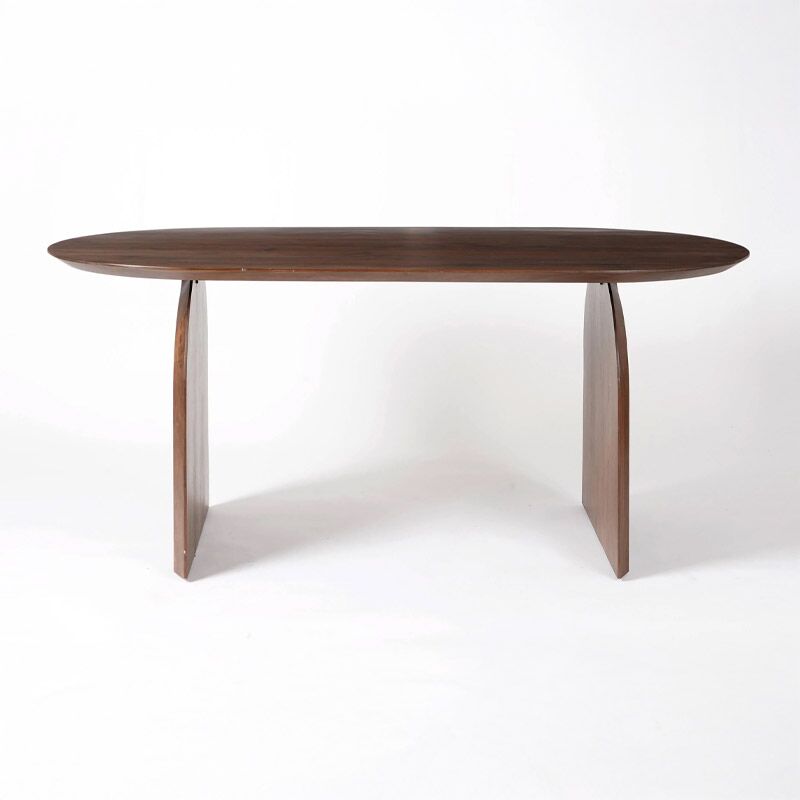 The dining table boasts a smooth, oval-shaped tabletop supported by sleek, solid wooden legs with elegantly chamfered edges.