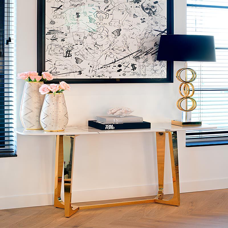 This design features a high gloss faux marble effect table top supported by a contrasting stainless steel base in a polished golden finish.