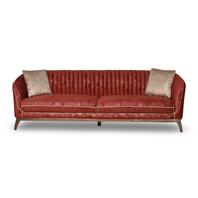 The Sofa adds a classy, modern touch to your living room with padded cushions for comfort and is supported by two long, wooden legs on either side.