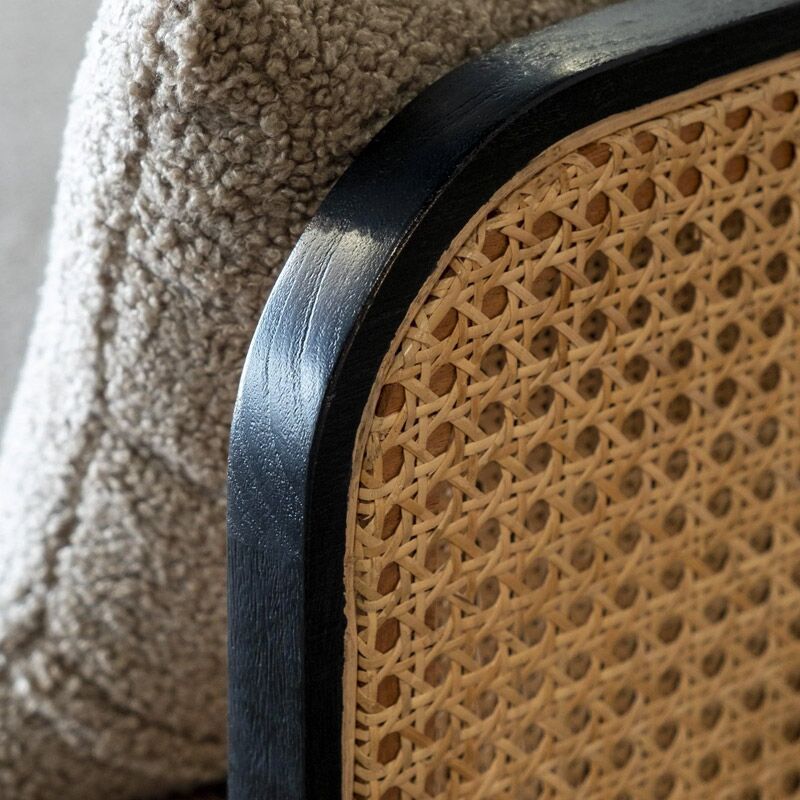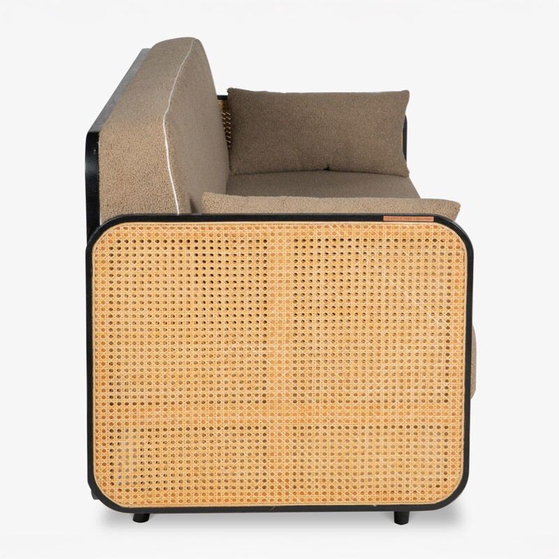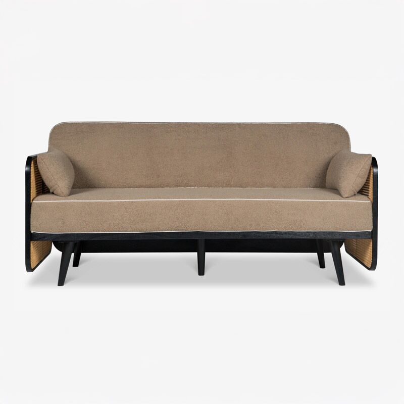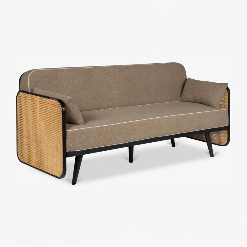 The sofa is expertly made from durable wood with a sleek black air brush finish and natural rattan cane. This stylish three-seater has slightly outward-slanted legs for stability and a contemporary touch.